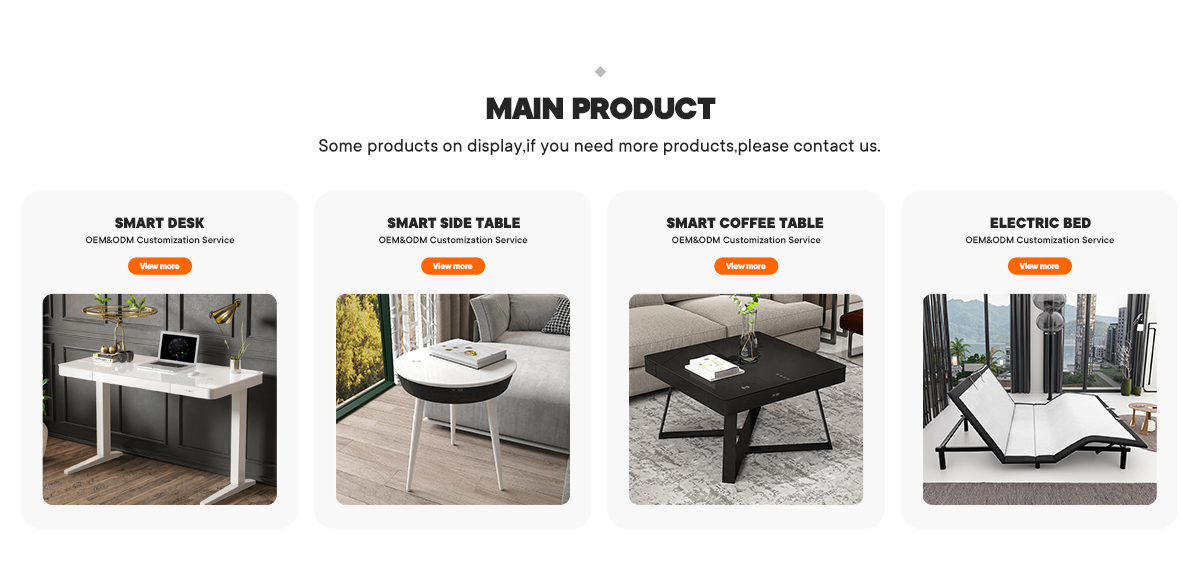Produk utama: Meja tinggi dapat disesuaikan dengan listrik, meja komputer pintar, Meja samping pintar, meja kopi pintar